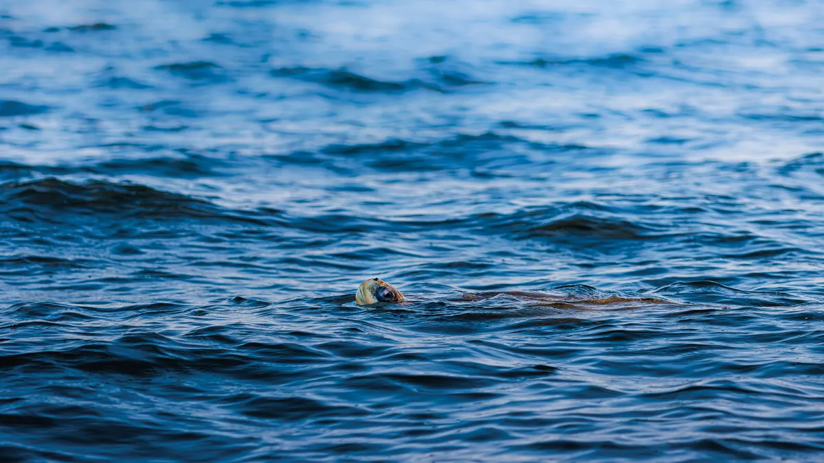 Open Pacific waters are viewed from a low, drifting vessel, where surface light, wave movement, and suspended color shape a fluid marine field. The Ridley turtle moves through this shifting space with calm precision, its form emerging against layered blues and soft reflection. The image records a moment of quiet passage at sea, where motion, light, and open water briefly align.