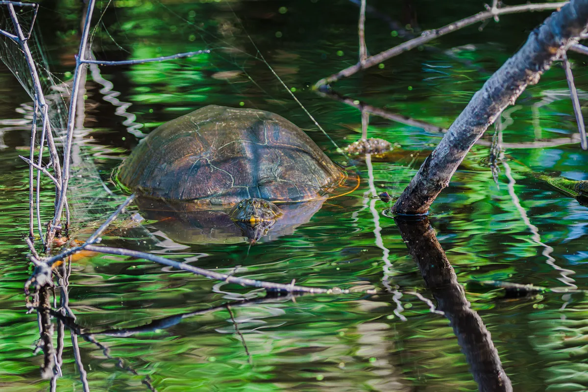 Amid luminous green water, drifting plants and softened surface light gather around a painted turtle in quiet suspension. Subtle ripples and suspended color shape a layered field of greens, where shell, eye, and reflection emerge with quiet clarity. The image records a moment of poised awareness inside a tropical lagoon, where water, vegetation, and stillness settle into balance.