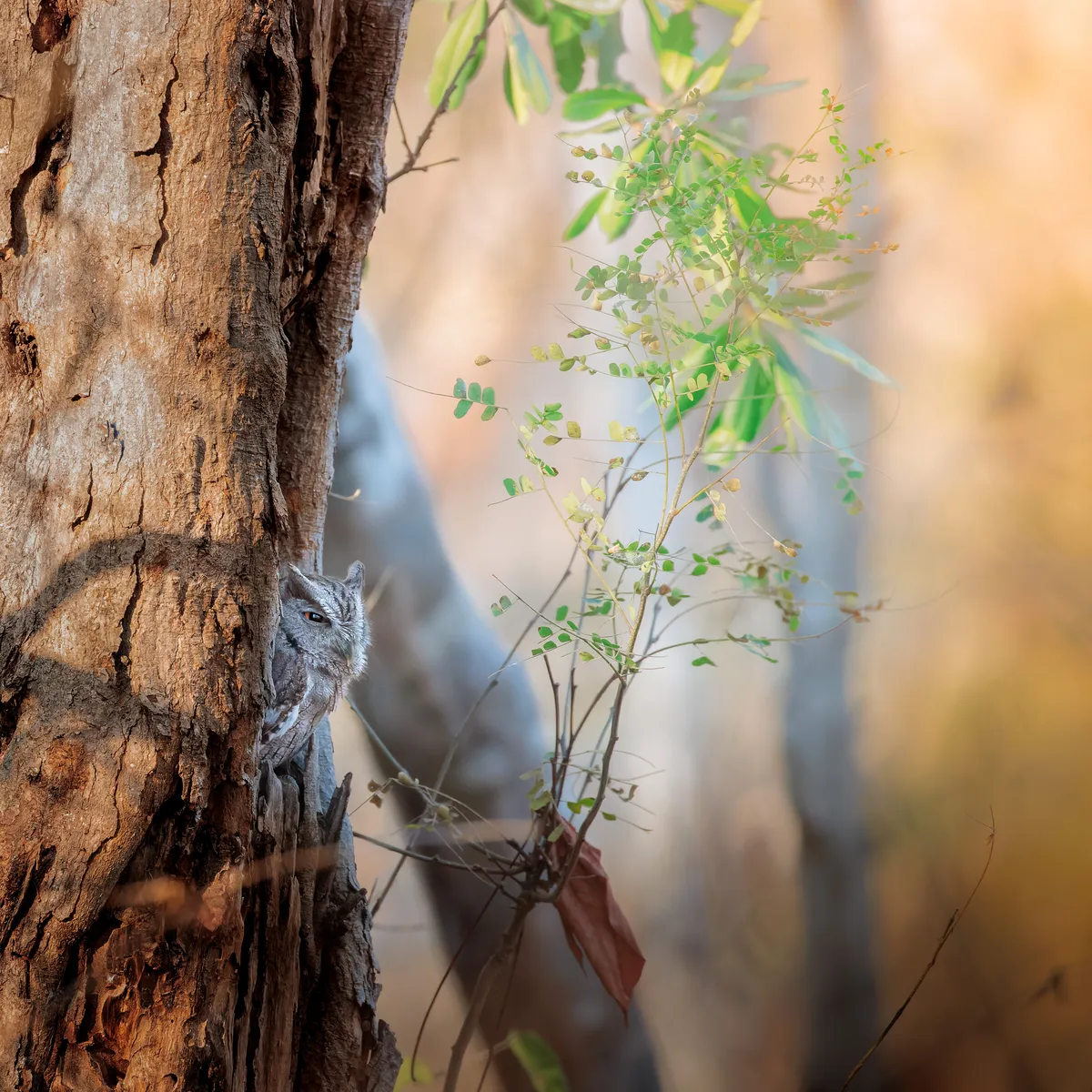 A Pacific Screech Owl rests within rain-darkened coastal woodland, its form held against layered bark and deep shadow. Muted forest light moves across feather and branch, revealing subtle pattern, soft contrast, and the quiet geometry of a nocturnal perch. The image records a moment of suspended attention inside the Pacific canopy, where texture, silence, and watchfulness converge.